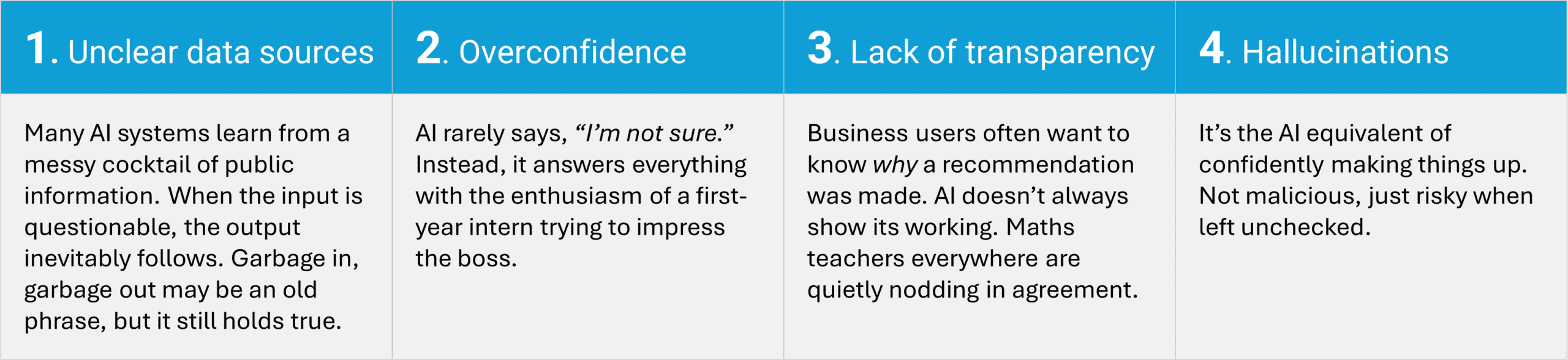 The problem isn’t that AI is mischievous or deliberately misleading. The issue is more subtle. AI doesn’t always know what it doesn’t know. And when it guesses, it often does so with the confidence of a seasoned politician. That’s where scepticism creeps in.